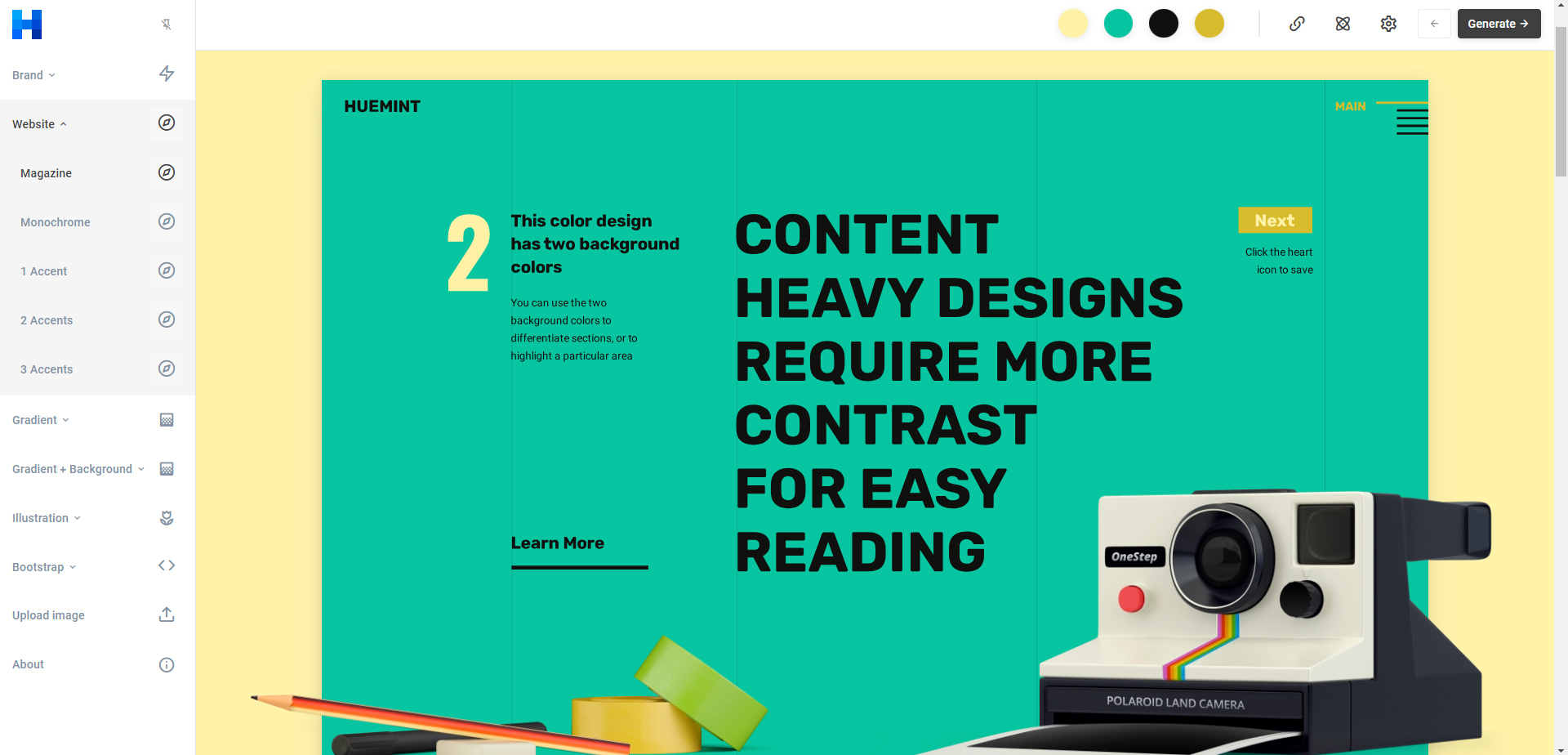 Color palette generator Huemint uses machine learning to create unique color schemes for your brand, website or graphic Launch
